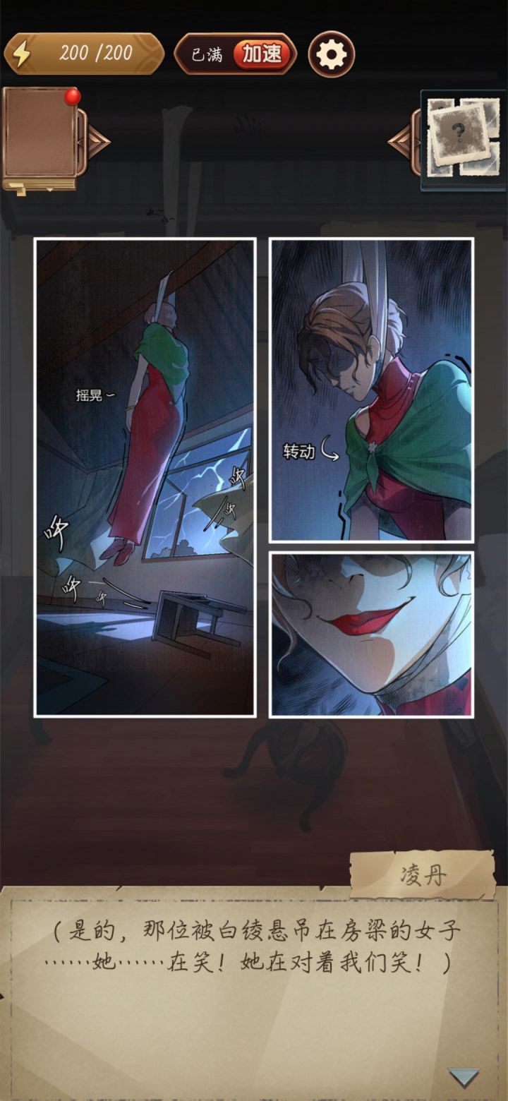 第四章剧情→黎水水房间的线索、逃跑的黎水水黎水水房间线索线索位置(线索分析5体力):1.窗户:【打开的窗户】、【窗框上的脚印】→怨魂索命(慕轻烟)2.房梁:【消失的白绫】(左边卧室场景)3.墙壁:【一张相片】4.梳妆台:【一盒油彩】→怨魂索命(黎水水)、【一本《江湖从话》】、【各式各样的化妆品】、【空首饰盒】5.衣柜:【空空的衣橱】推理(推理验证10体力)1.黎水水房间的线