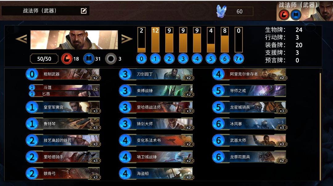 分享一下卡组,武器大师,强度不错,最快5费斩杀。传武可以不带,没有太大强度,但有时候有奇效。骑兵核心过牌,打后期不能没牌,在有海盗船的时候,下场就抽。武器大师打后期担当。其他随从选择减武器费,加武器叠身材,加武器buff的打手。还可以加松家德之旅,打打后期,不过估计打不到这么久。