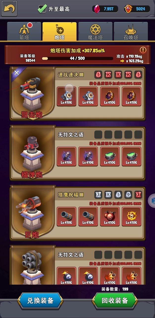 个人后期四塔最后一次变动(1.1.6版本)主攻塔改为炮塔了,后期同样的连击确实比箭塔厉害很多,我的搭配很简单,红塔加双连击。主塔是狙击炮(符文狙击之力)>1.1.7版本更新了主塔符文狂暴之力>1.2.0更换了爆发之力辅助箭塔是精准箭塔(符文飓风祝福)辅助魔法塔雷电塔(符文雷霆祝福)辅助召唤塔鬼蝎塔(符文爆炸鼓舞)最后配个效果视频看看,如下