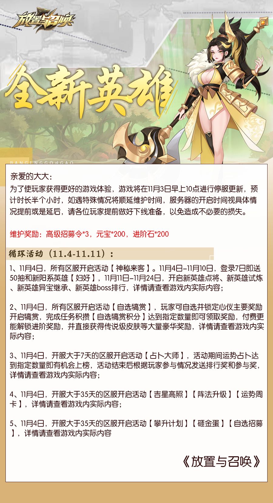 《放置与召唤》更新预告:五十连抽免费送,新混沌英雄上线!