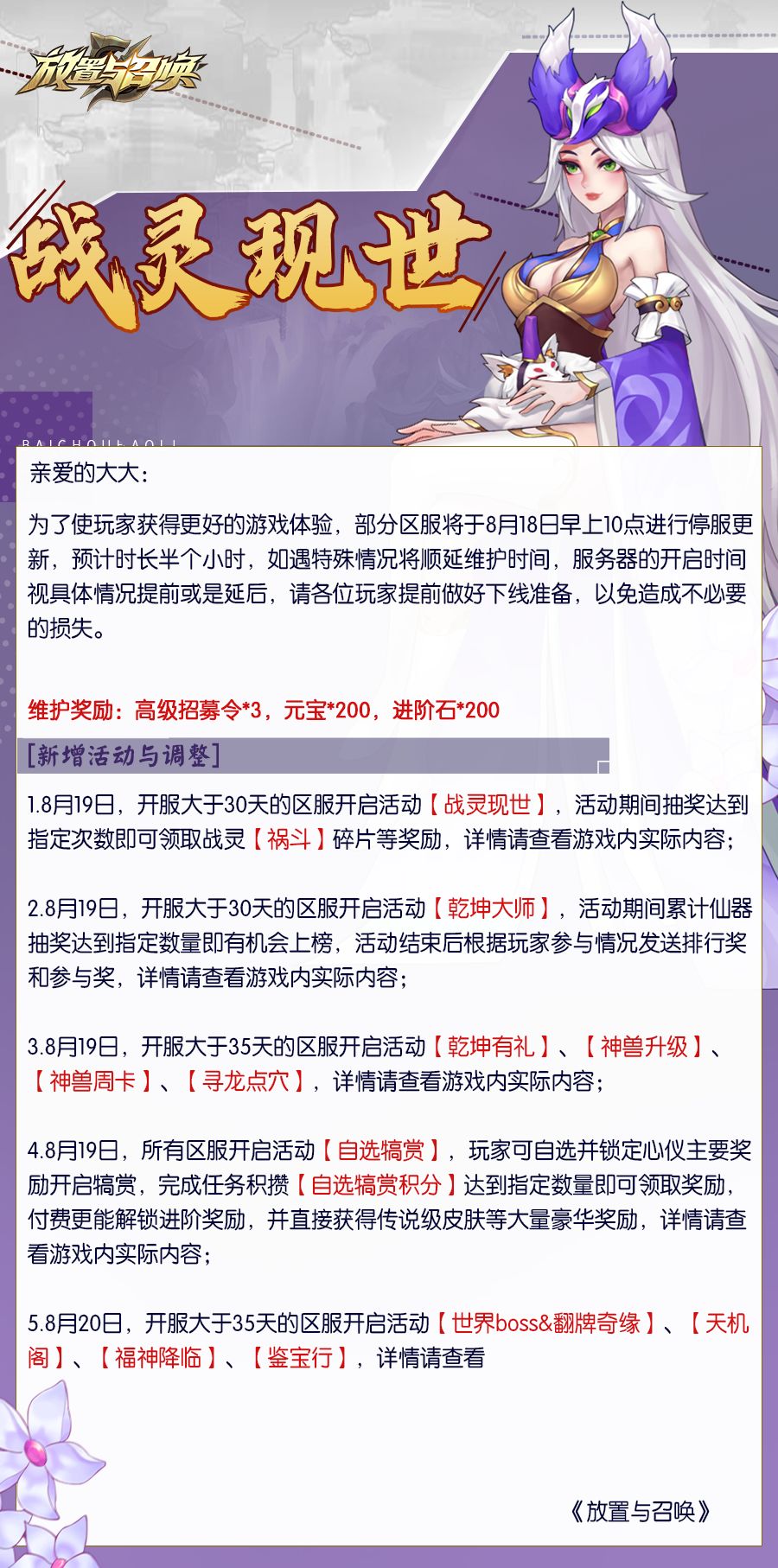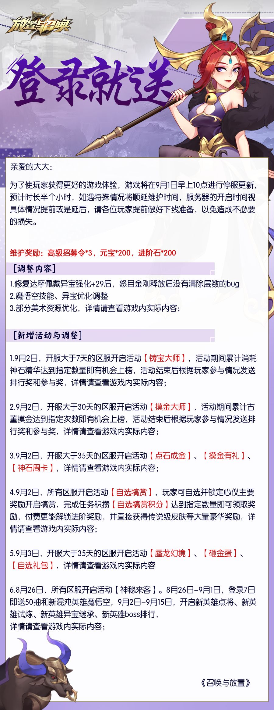 亲爱的大大们 《放置与召唤》将于9月3日上午9点30分 进行停服更新 预计时长半个小时 请各位玩家提前做好下线准备 以免造成不必要的损失哦~ 让我们一起来看看 本次更新带来了什么~ 维护奖励:高级招募令*3,元宝*200,进阶石*200 一、调整内容 1. 达摩时装【毁灭之拳】进入时装商店; 2.【异宝置换】现在可选择带有强化等级的异宝,置换强化等级继承; 3. 优化幸运福袋本服福袋积分的解锁数量