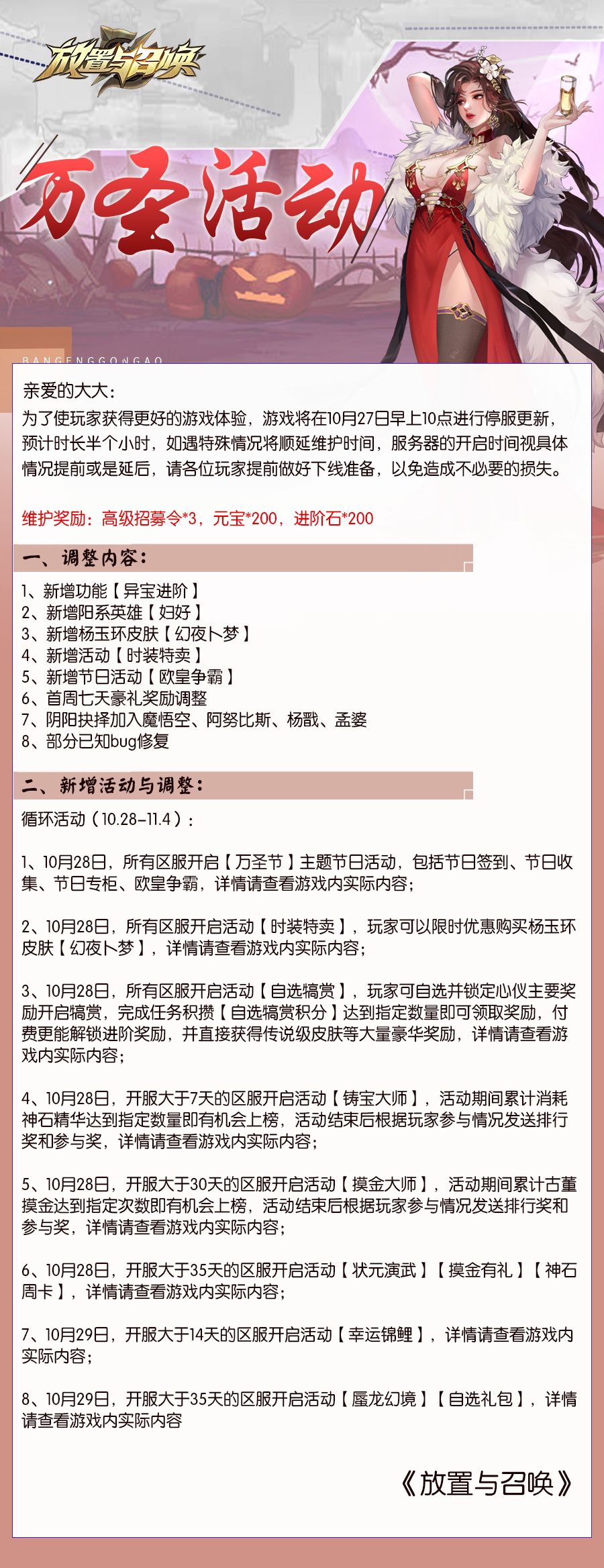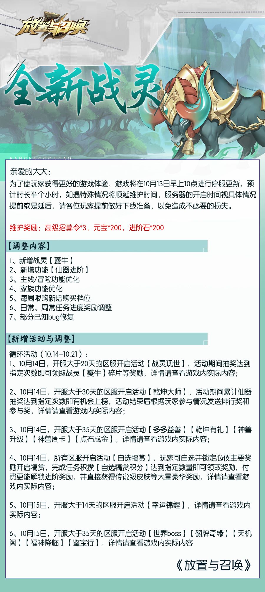 亲爱的大大们好呀!明天咱们《放置与召唤》又将迎来一周一次的更新!大家都准备好了没有呢? 想知道本次的更新内容的话,就接着往下看吧~ 亲爱的大大: 为了使玩家获得更好的游戏体验,游戏将于3月24日早上9点30分进行停服更新,预计时长半个小时,如遇特殊情况将顺延维护时间,服务器的开启时间视具体情况提前或是延后,请各位玩家提前做好下线准备,以免造成不必要的损失。维护奖励:高级招募令*3,元宝*200,进