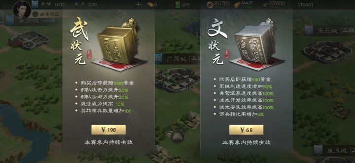 简要叙述双倍198完成的情况下 月卡的性价比高于直接充黄金如果没有 则需要考虑双倍和buff的倾向半挂机情况双倍性价比更高 因为空置时间 损失大高活跃情况下月卡则比双倍更泛用性更高在国战时 一次性击溃敌人比多次击溃兵员损失更少而且可以保证第一时间前线驻扎而不需要再次跑图在此 月卡玩家相较于无月卡玩家效率更高从而可以加速攻城文武状元各自有各自的优点武状元的优点是直观提升攻防对于