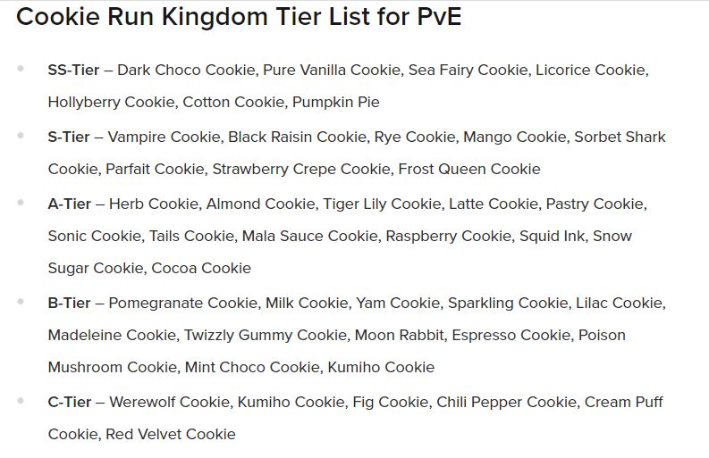 搬运外网的一份一月的节奏榜,仅供参考 【PVE】 SS-Tier: 黑巧克力饼干,纯香草饼干,海妖精饼干, 甘草饼干,圣莓果饼干,棉花饼干,南瓜派饼干 S-Tier:吸血鬼饼干,黑葡萄干饼干,黑麦饼干,芒果饼干,雪酪鲨鱼饼干,帕菲饼干,草莓可丽饼饼干,冰霜女王饼干 A-Tier:药草饼干,杏仁饼干,丛林战士饼干,拿铁饼干, 千层酥饼干, 索尼克(联动),特尔斯(联动),麻辣饼干, 覆盆莓饼干,墨鱼
