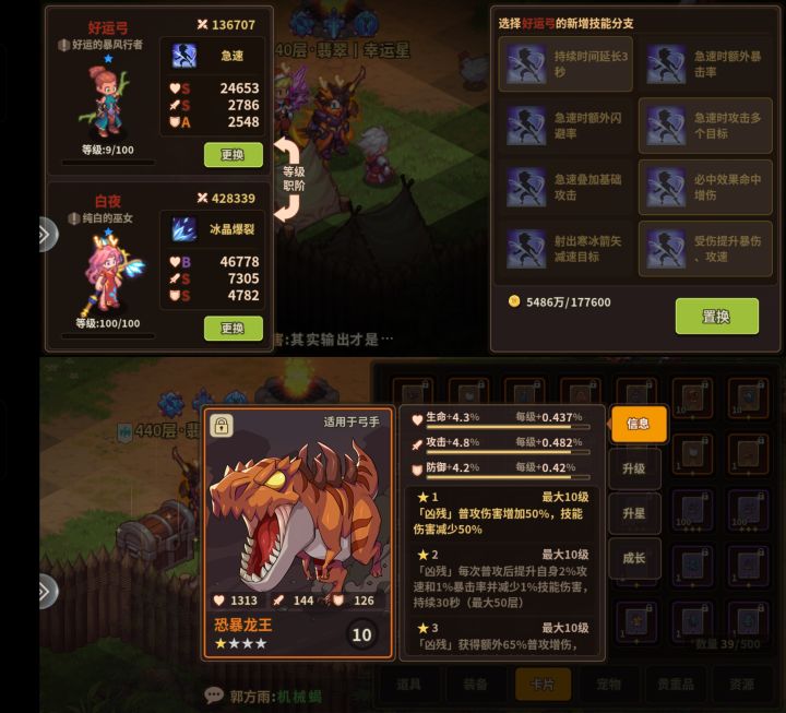 1:新人开荒主输出优选①毒箭+女王②火焰爆轰+野猪③极速+暴龙2:辅助卡①橙卡:章鱼 (最强辅助卡)②紫卡:火魔(技能增伤),迅猛龙(攻速流),熔岩骑士,熔岩怪(撑血量)3:有用宠物不含战令宠(尽量养红色按照流派选择)不严谨,不全面,金属史莱姆,小黑龙, 机械蝎4:建材爆仓后看板任务资源变化粉尘→卡牌经验瓶石头→装备强化石水晶→加速装置(游戏加速道具)木头→宠物食物5: