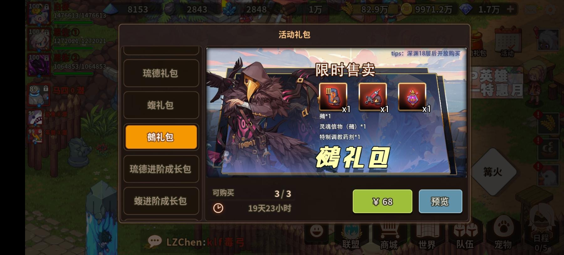 虽然大家嘴上说着分币不氪但累充却很诚实的 +882 了(98x9).本周的宝石省流:依然只建议有强烈氪金欲望的后期玩家氪乌鸦的包很适合会战,生命 + 选攻击刘德这个可以暴伤 + 选生命 / 抗暴电弓的感觉性价比相对低得多上周观点:https://www.taptap.cn/moment/760658609972446608.本周的角色省流:如果乌鸦白夜都缺,就氪乌鸦,春节选白