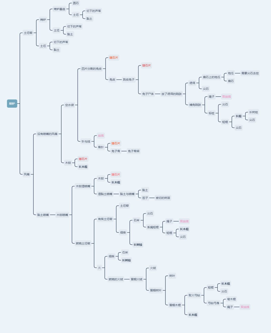 哈喽!大家好,我是奶思~ 今天给大家带来的是铁器的制作与用法 铁器的制作~ 1.土坯窑+细柴=有木柴的土坯窑. 2.长木棍+取火弓钻=冒烟木棍. 3.冒烟木棍+树叶=冒烟的树叶. 4.冒烟的树叶+刺柏火绒=冒烟的火绒. (要注意好时间哦 不然火会灭的) 5.冒烟的火绒+木柴=火. 6.引火棍+有木柴的土坯窑=燃烧的土坯窑. 7.燃烧的土坯窑+土坯=密封的燃烧土坯窑. 8.密封的燃烧土坯窑+30