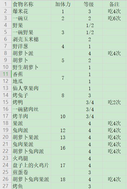 四级食物:一碗猪肉丝(家养),烤羊肉(家养),盘子上的火鸡片,火鸡腿,烤鸭(烤炉),各种派(胡萝卜派,果派,兔肉派,胡萝卜果派,兔肉果派,胡萝卜兔肉派,葫芦萝卜兔肉果派) 一碗猪肉丝(家养),烤羊肉(家养),烤鸭(烤炉): 暂无养殖过程,烹饪过程参考即可 烤鸡: 各种派(胡萝卜派,果派,兔肉派,胡萝卜果派,兔肉果派,胡萝卜兔肉派,葫芦萝卜兔肉果派):