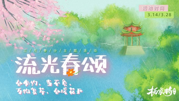 💐亲爱的杨家军们:雨霁风光,春分天气。千花百卉争明媚。🌼花落花开皆有序,人间处处是芳芬。《杨家将演义》祝各位小将军春风得意,喜气洋洋~【活动将于3月14日正式开启!!!】🔻【流光春颂 · 活动一览】1. 登录礼包丨春分节气2. 全新特技丨《雨霁风光》3. 勋章返场丨龙兔生肖勋章4. 超值礼包丨往期活动物品返场5. 活动累计丨活动专属限时累充6. 心悦商城丨游戏专属活动满减