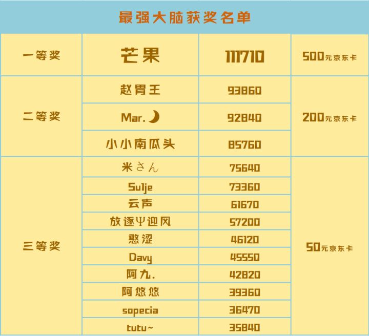 “最强大脑”活动已结束,名单上的小伙伴请进入官方群联系菜园子领取礼品卡哦~~ 感谢各位小伙伴一直以来的不离不弃,匠游网络的第一次活动正式收官啦,未来也请大家多多期待哦~ (据说明年有新游戏耶咕咕咕)