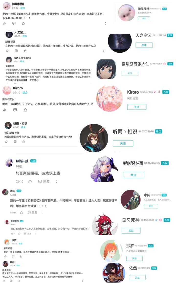 各位亲爱的御主大人好,这里依旧是给大家带来福利的加百列酱~在此先给大家拜个早年!然后呢,然后呢。。。加百列酱给御主大人们准备好了新春礼物哟!只要在论坛板块写下您的新春祈愿(当然,需要跟幻象回忆有关哟),就有机会获得加百列酱准备好的压岁钱有木有!这一期又有哪些Lucky Master产生呢?让我们拭目以待~~【活动时间】2021.02.10-2021.02.18【活动形式】在《幻象回
