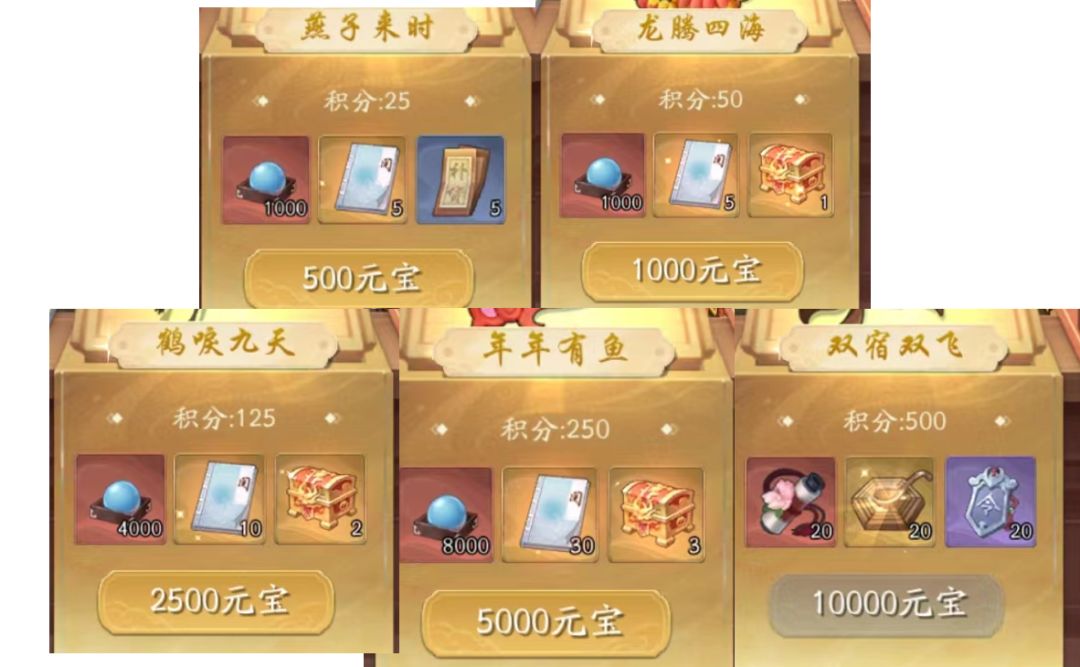 这个活动也不需要啥攻略 有元宝买满就完事了 总体肯定还是划算的 而且帮派奖励也很棒~ 所以有元宝肯定必买的 这里附一下各元宝档位的内容,方便需要的朋友查看 下图是前边几档充值的内容: 【务必注意:68以上的这次实在不舍得买,但目测跟上次踏青内容没有任何差别,所以128档、和328档我发的是之前踏青的物品内容,不保证这次的是否一样!!!】