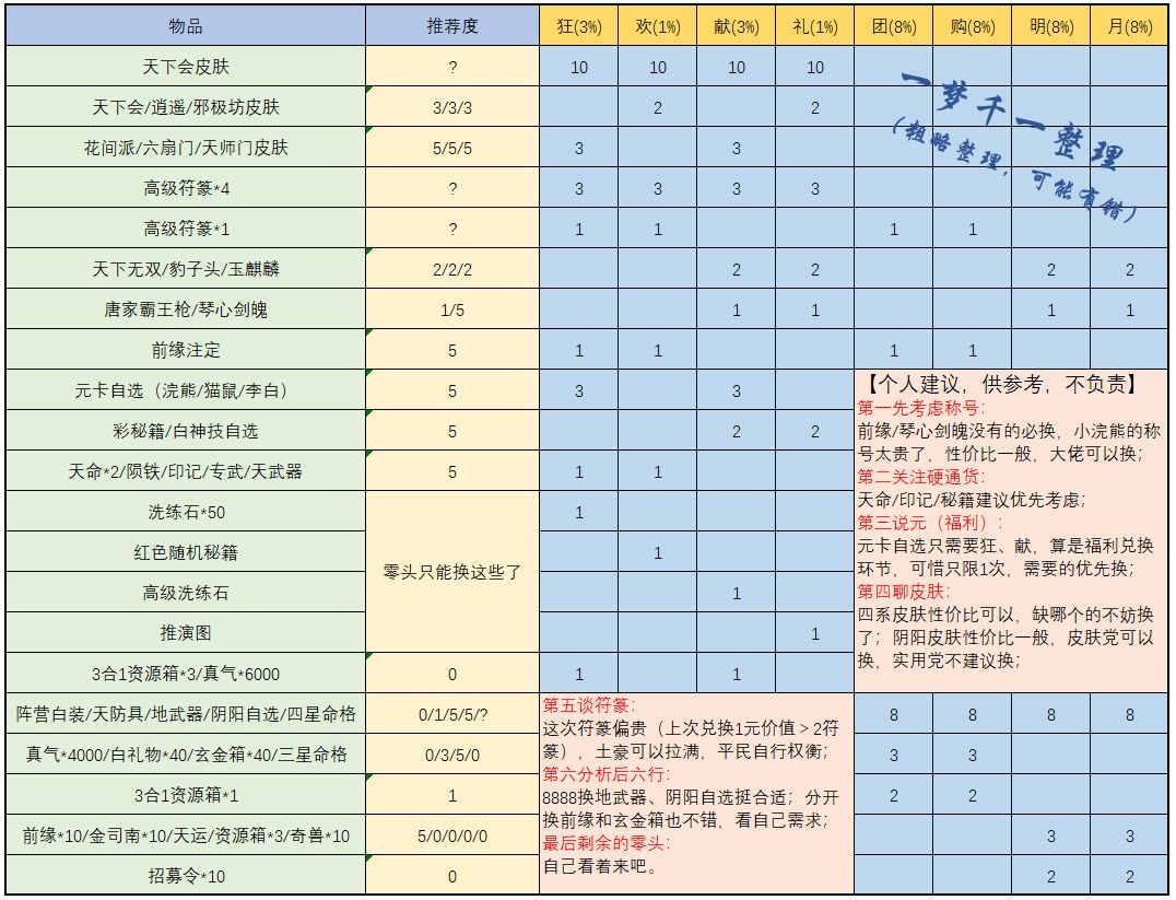 ———————————————————— 欢迎大家来梦千的交流群:692591771,里边有更多游戏相关资料和许多大佬帮忙答疑,梦千人格担保:群里绝无任何广告。 ———————————————————— 下面粗略整理的兑换表,可能有错,大家帮忙检查下。 另外附了一些我的兑换建议,个人意见,大家仅供参考,我不负责哈。 10月5日的一个补充: 第1名:返利50% 第2名:返利40% 第3名:返利35%