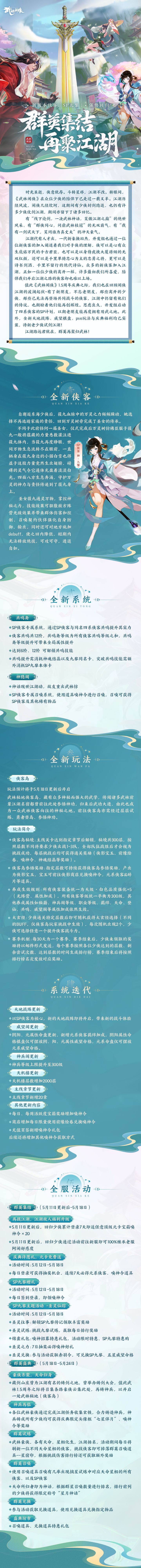 「群英盛典·再聚江湖」1.5周年庆典活动将于5月11日正式开启,本次版本更新中,开发组启动了四系侠客的SP计划,以期老朋友能再度拥有用武之地,全新SP侠客神·九黎即将登场!此外,全新天地战阵、威望棋盘、PVE玩法与庆典福利均已实装,待新老少侠试剑江湖!
