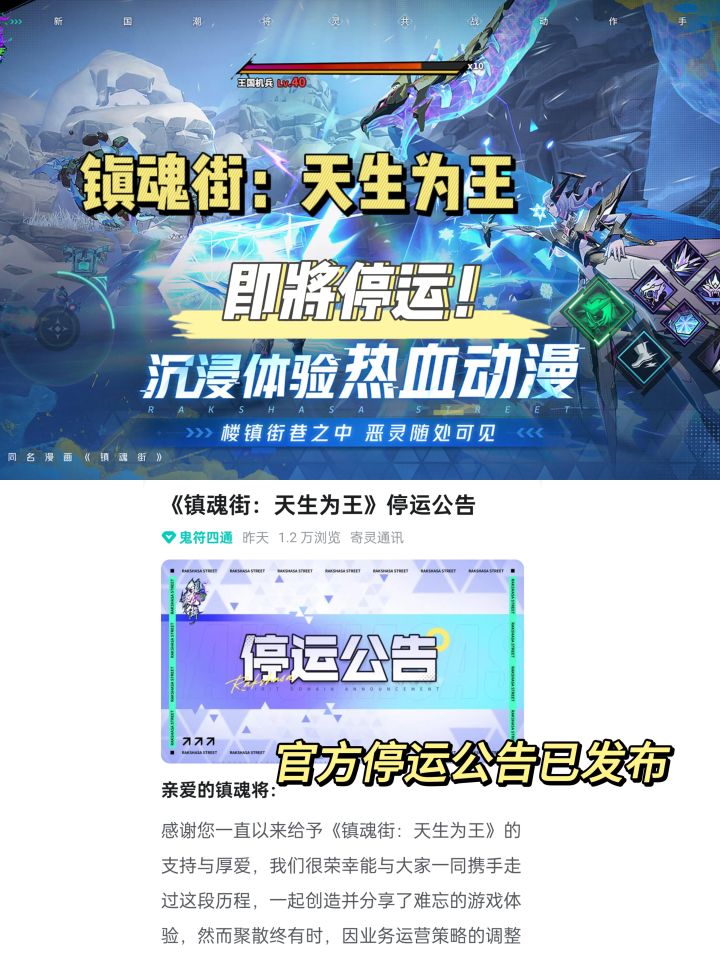 亲爱的镇魂将:感谢您一直以来给予《镇魂街:天生为王》的支持与厚爱,我们很荣幸能与大家一同携手走过这段历程,一起创造并分享了难忘的游戏体验,然而聚散终有时,因业务运营策略的调整需要,我们遗憾地宣布:《镇魂街:天生为王》将于2024年6月30日正式停止游戏的运营。 【具体停运安排】1、2024年4月30日12:00:关闭游戏下载入口,关闭游戏客户端内的玩家注册入口及新角色创建,停止游戏内的充值
