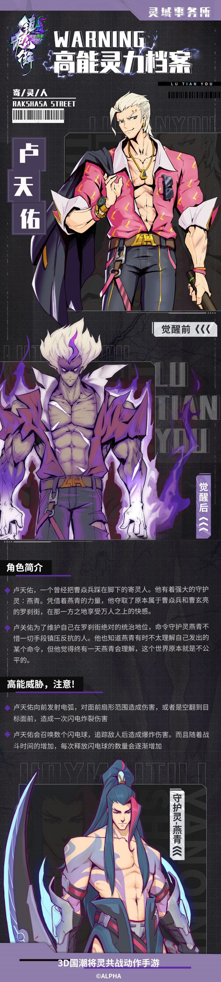 Heeeey bro,欢迎来到#高能灵力档案#!今天的高灵选手来自大家熟悉的罗刹街,他曾经是个仗势欺人的流氓地痞,也是一个把曹焱兵踩在脚下的寄灵人——卢天佑。虽然嘴边时常挂着嘲讽的笑,但凭借着其守护灵燕青的强大力量,反抗他的人还是免不了被镇压的命运,当时正值年少的曹当家也是如此。当曹焱兵带着弟弟回到罗刹街,想要夺回属于自己的东西时,卢天佑露出讥讽的笑容。他觉得那种”只要自己努力,就一定可以改