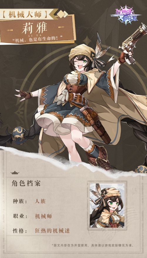 【英雄故事】 人族有着惊人的创造力,但他们并不喜欢处理废品,往往是拉着一整车的破烂,到穷乡僻壤一丢了事。莉雅就生活在其中一个废品堆积的山野中。齿轮、钉子、破布一直是莉雅的玩具。她善于将它们重新组合,创造一些稀奇古怪的玩意儿:超省力的耕地机、利用风力前行的四轮车、基本能听的收音机……父母时常会带着她进城卖蔬果,她就趁机把自己的小发明带去送给顾客。久而久之,“机械少女莉雅”在人族小城里有了些名气。