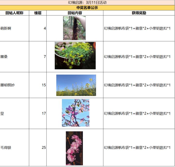 春分刚过,冒险家那里是否春雨绵绵呢?又有5位幸运的冒险家获得了奖励,一起来看看吧:评论区的春色已经溢出屏幕啦,小栗挑来挑去都好喜欢,决定将每一张符合要求的春景照片都在幻境启源官方公众号上展示,感谢冒险家们增添的春意!(*^▽^*)※由于疫情防控,奖励发放会有延迟,请冒险家们耐心等待哦❤============================ 天气回暖,终于不用裹成粽子啦!安洛克大陆已是百