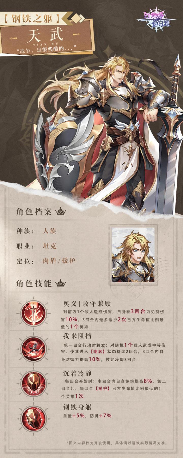 上次小栗介绍了天武的背景故事,钢铁之躯的他将在实战中发挥怎样的作用呢?哼哼~小栗这就揭晓答案。【技能介绍】天武的防御机制在于独特的【援护】系统,可以保护生命值比例最低的一位友军。在天武面前,任何偷袭和切后排的战术都嚣张不起来。※当前为测试版本,画面仅供参考同时,天武自身也可以提升防御力,嘲讽敌方,既能以钢铁之躯保护危难中的队友,也能只身向敌人宣战,是坦克中的多面手哦~※当前为测试版本,画