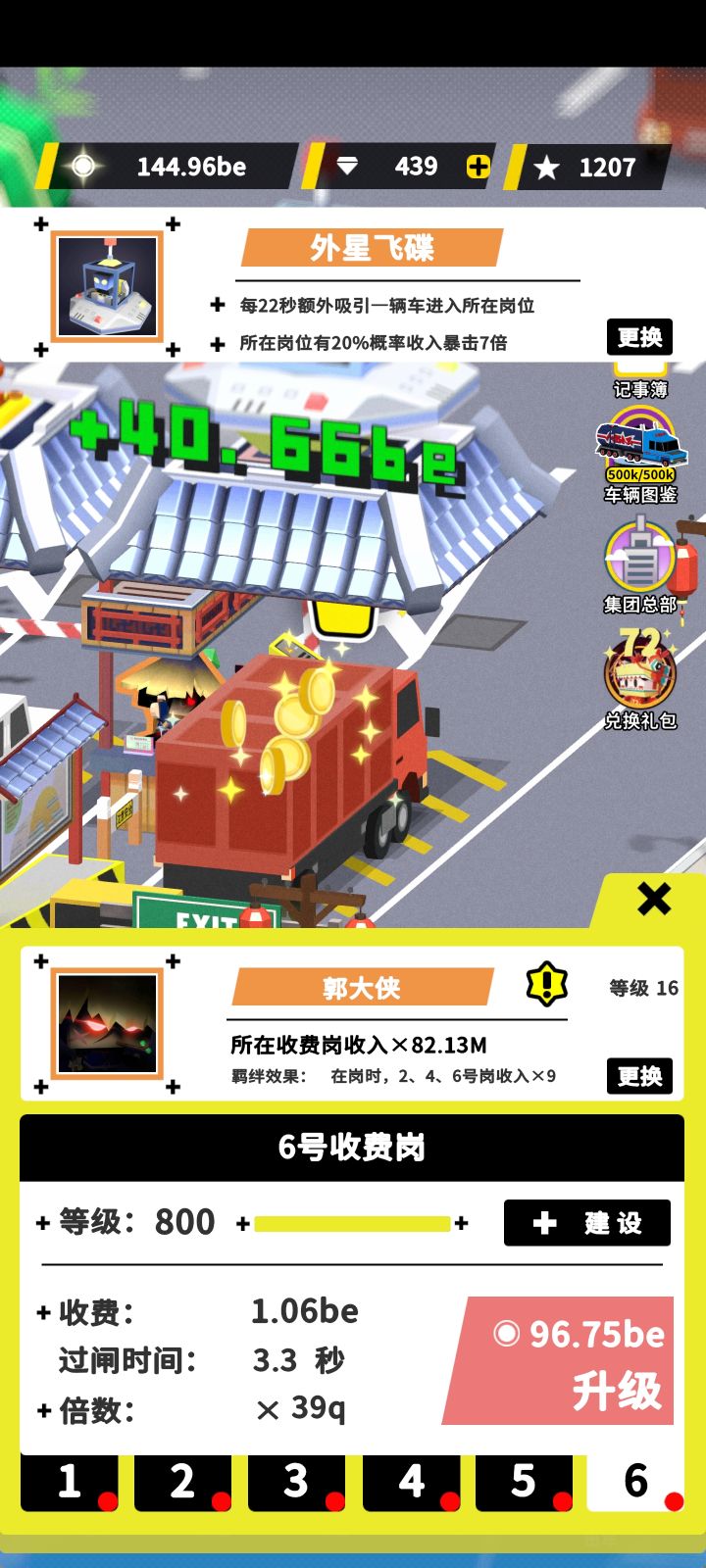游戏内两种货币,金币是基础货币,用来升级收费站,伴随升级,金币的获取量也增加。另一种是钻石,用来抽卡提升收费站员工等级。