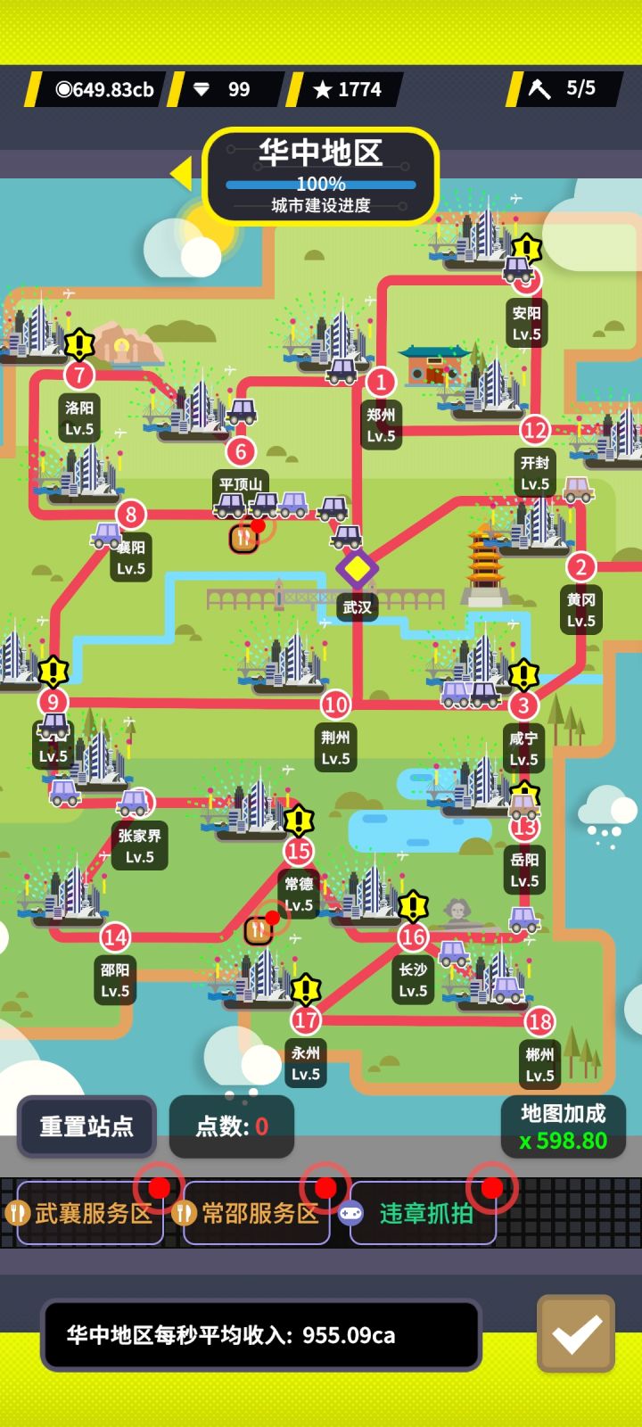 游戏核心玩法就是升级收费口,开新收费口,开新城市,开新地图。游戏内现在地图出到了西南地图。一个地图和若干城市,收费口是1-6号收费口,金币量也是1-6号递增。城市的解锁需要点数,点数每开一个收费口会送一点,当前地图总体进度达标也会送。而地图的解锁则是通过达到当前城市的进度来解锁。