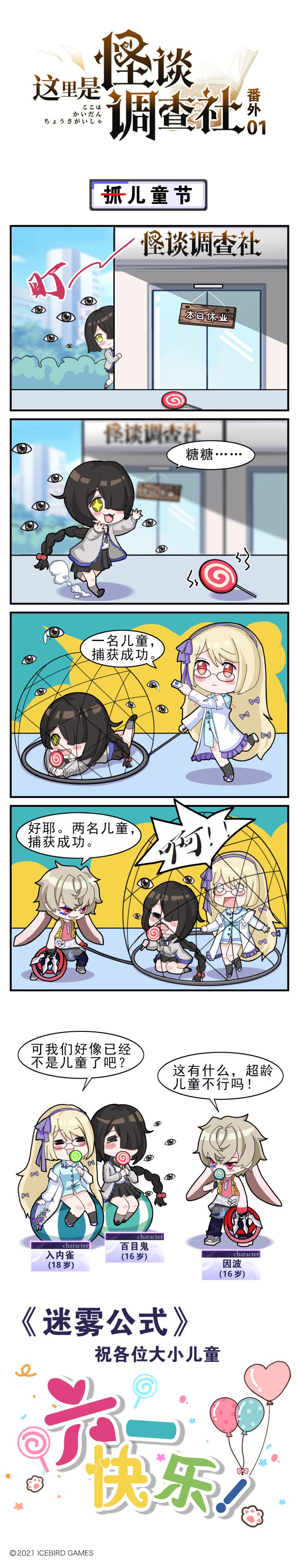 为了庆祝六一儿童节的到来,我们紧赶慢赶终于把四格漫画做出来啦~肯定已经有调查员发现了,怪谈调查社还未开业,具体开业时间,请各位调查员密切铃彦姬带来的最新情报~最后祝各位调查员儿童节快乐,一起做一天小朋友吧!友情提示:掉在地上的棒棒糖不要随便捡起来吃哦~官方QQ群:909104968,欢迎调查员来找我们玩耍~