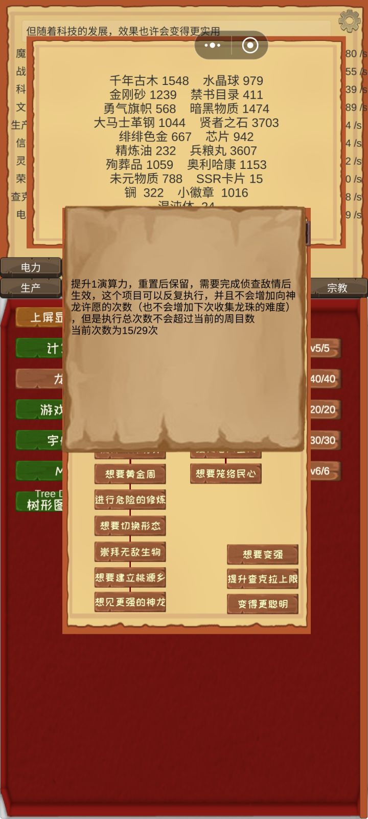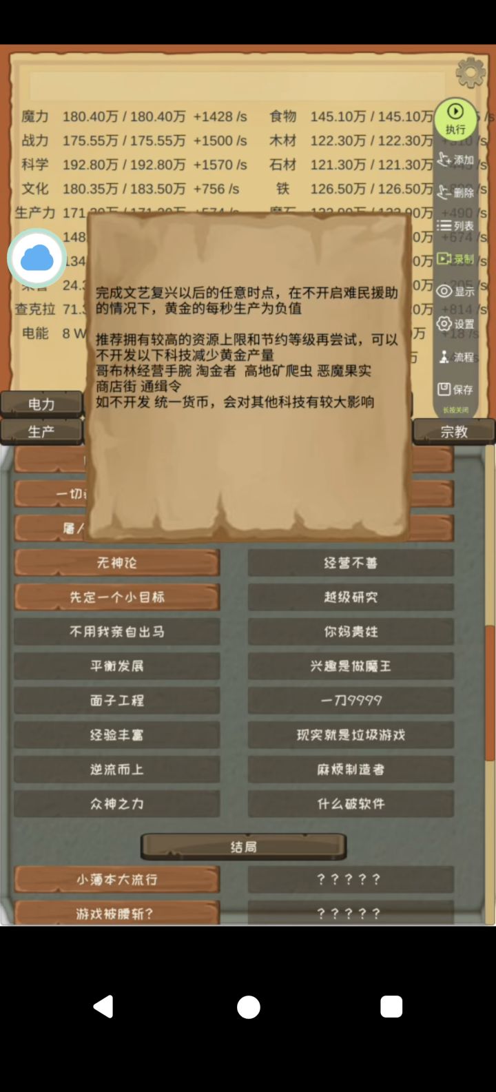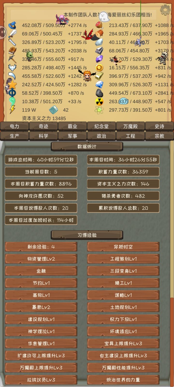 中间比较卡的,魔力,战力,文化,科技,食物等上限都可以通过工程整理和对应的上限点数解决。