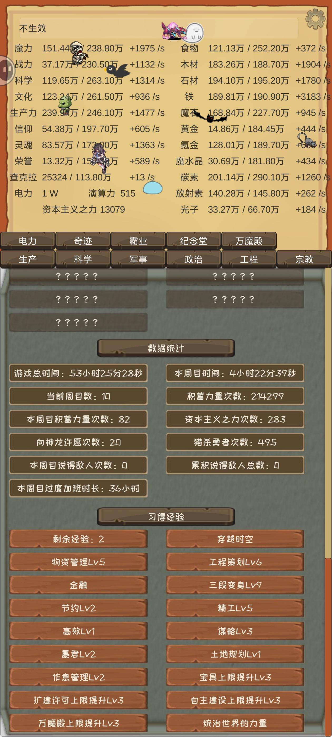 不要学我,我只是随便玩玩。本来想挂到50小时拿成就的,发现太久了,1%没必要。2000演算力的那个逃跑了,硬怼要很久很久。因为2周目上限很低,所以不得不浪费大量查克拉在提高上限上。其中最难提升的是黄金上限,有一个科技要290w解锁,最后也只是勉强达成。中间比较卡的,魔力,战力,文化,科技,食物等上限都可以通过工程整理和对应的上限点数解决。