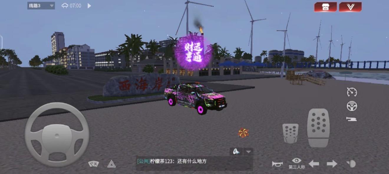 打卡点:西海岸海滨沙滩座驾:粉紫霓虹涂装越野皮卡家人们谁懂啊!《卡车人生》1.8.3版本的海南地图简直是把现实里的椰风海韵搬进了游戏里🌴!今天开着我这台粉紫渐变霓虹皮卡冲去西海岸,一看到这块“西海岸”石碑和远处的风车、椰林,直接就被美晕了!紫色的“时来运转”福袋飘在半空中,我赶紧把车停过去合影,感觉这波欧气直接拉满✨。海南的沿海公路开起来太爽了!一边是椰林和沙滩,一边是鳞次栉比的城市高楼,