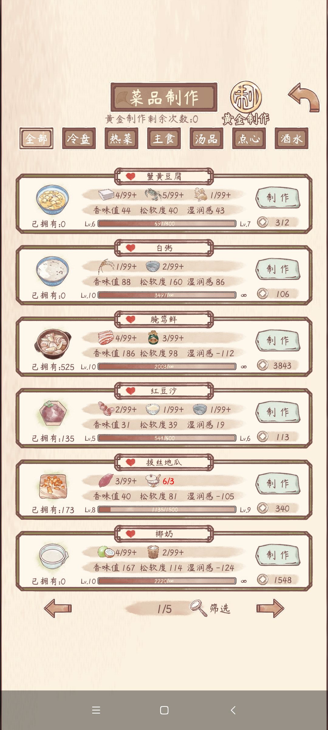 时隔四年回归,5月1日新建了个号,实时记录赚钱步骤。 简单来说,善用【黄金肥料】和【黄金研发】 ✅第一年开始 ,把【白粥】用黄金研发干到天级,虽然钱不多,但是刚开始嘛!先苟着。 白粥:1水稻2泉水,春季出产。 👉🏻有南瓜种子需求就不要升级那么快,如果遇到节日活动,可以用活动物品换南瓜种子,或者在前五年从夫人手里换,第六年开始就不一定能刷到南瓜种子。 ⚠️在此期间集市遇到以下菜谱和食材,先囤和先种,