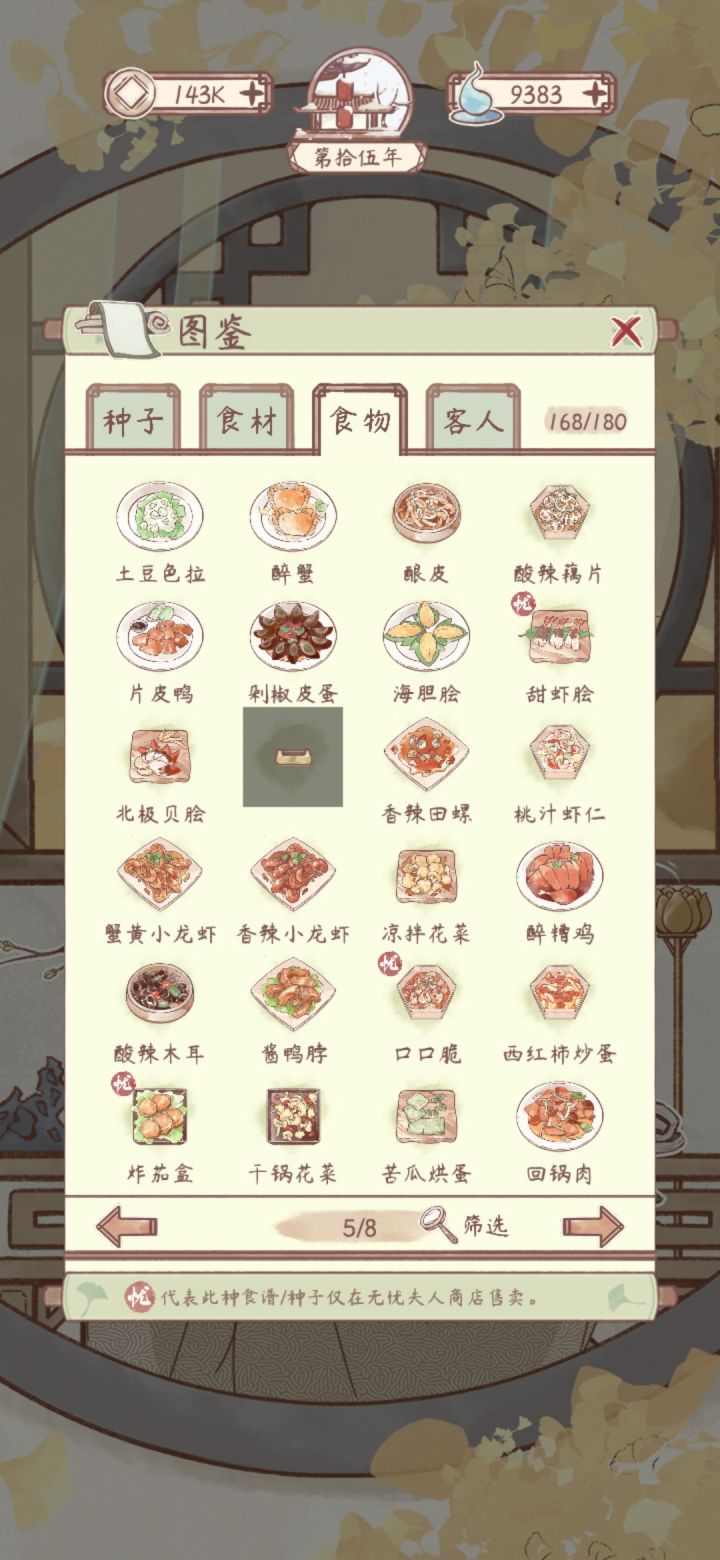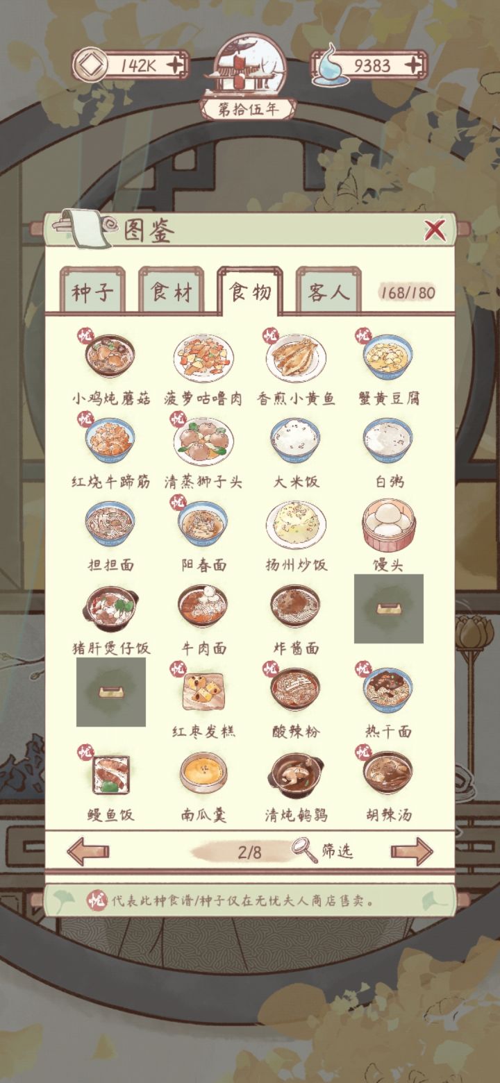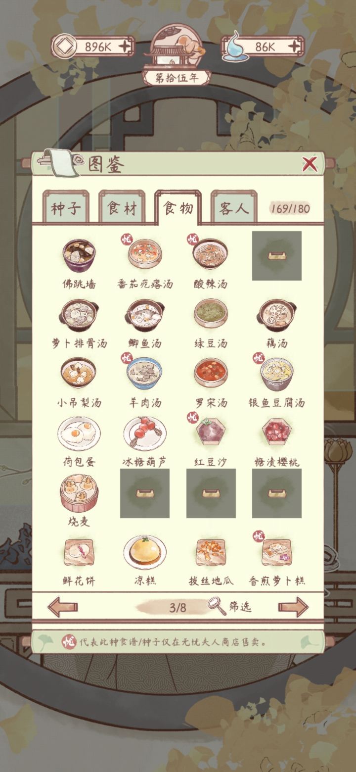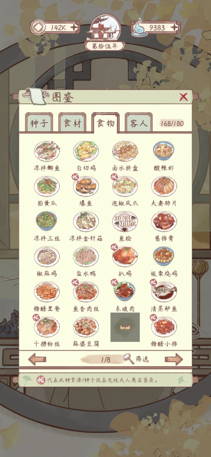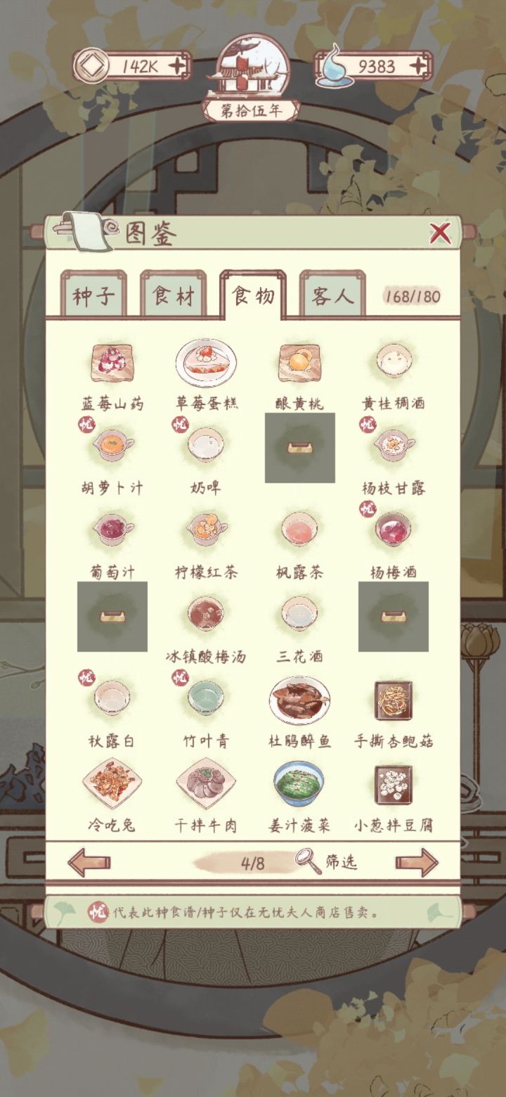 目前已经收集了168份菜谱,见图合集暂时没有发现的菜谱盘点:①八宝糯米饭②豉汁凤爪③桃夭④腌笃鲜⑤虾饺⑥蜜汁糯米藕⑦鱼脍拼盘⑧佛跳墙【完成无忧夫人的剧情赠送】⑨京华露酒⑩番茄牛腩11.青梅酒12.黄焖鸡米饭据说是12道成就菜谱,客人剧情带来的,也不知道怎么才能触发剧情,有拿到的小伙伴可以分享一下吗??跪求。