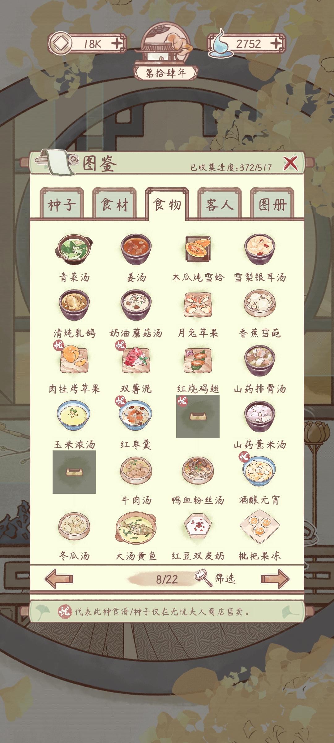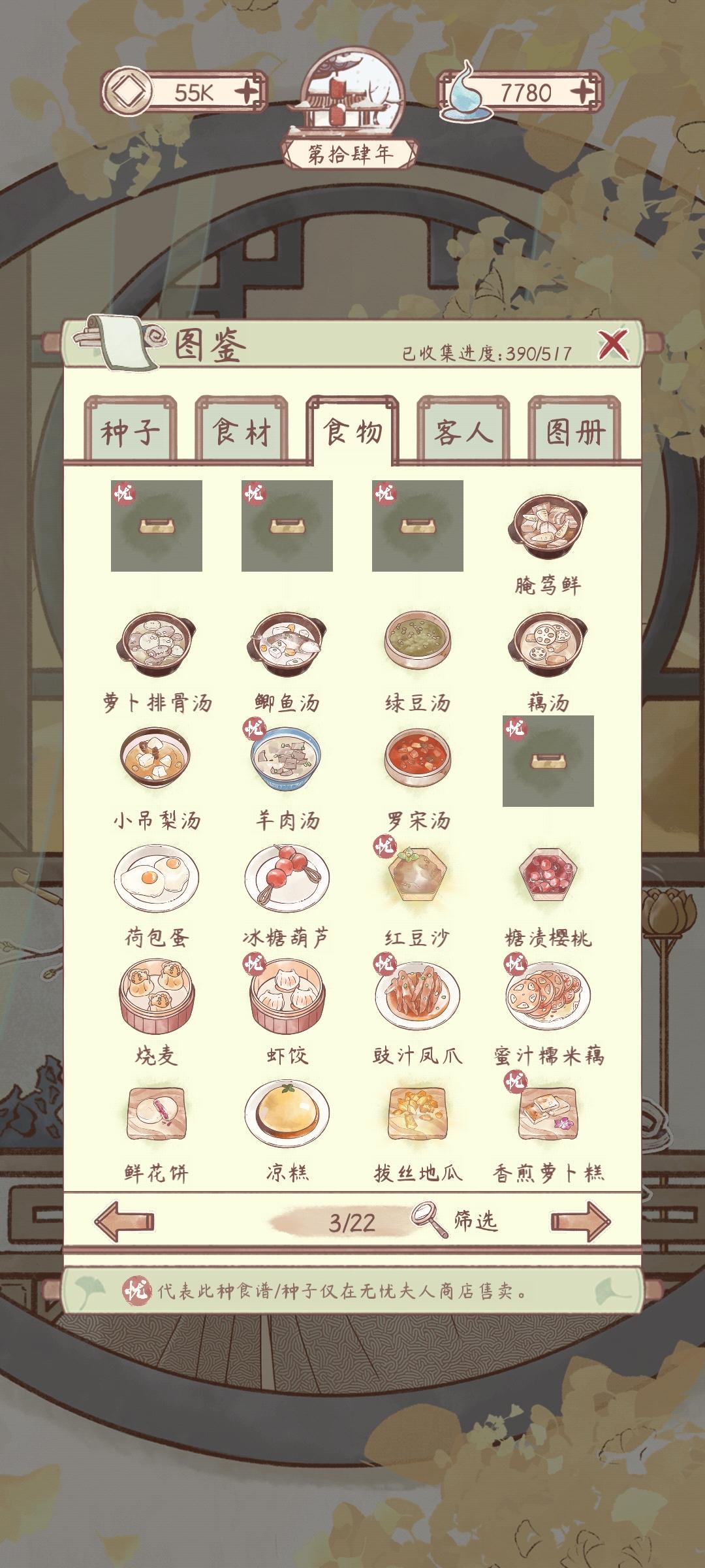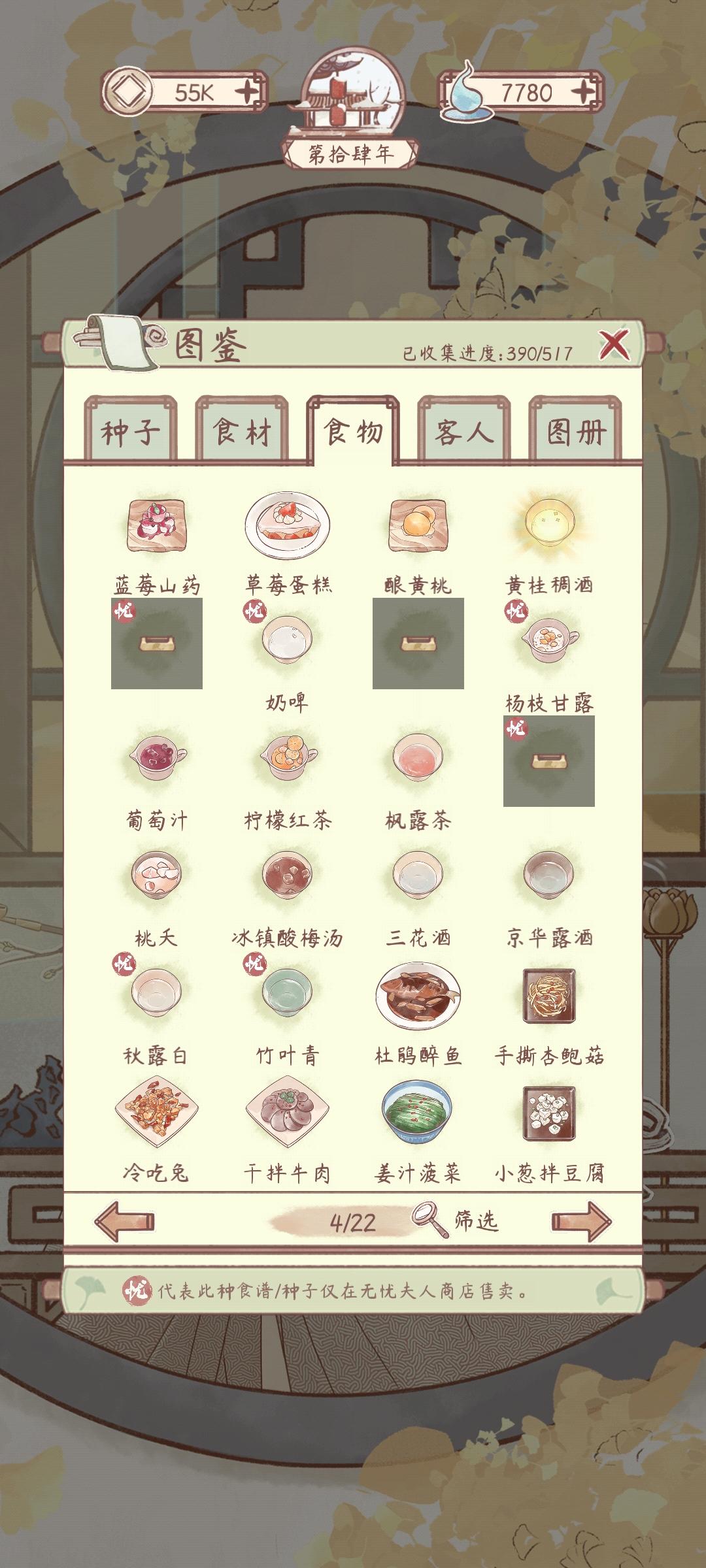 ✿客人❀药掌柜❀剧情:壹·奇怪的客栈掌柜:【第一年】贰·鸣沙客栈:前台装修叁·审判:购买所有种类家具各一件肆·死生轮回:【三十年】岱君客栈堂食50次伍·抉择:【三十一年】❥剧情成就食谱:无——❀无忧夫人❀剧情:壹·无忧夫人:【第二年】贰·三十年:触发前置剧情,无忧夫人商店购买1次叁·心愿未了:触发前置剧情,南瓜羹一级肆·公主:触发前置剧情,南瓜羹二级伍·无忧:触发前
