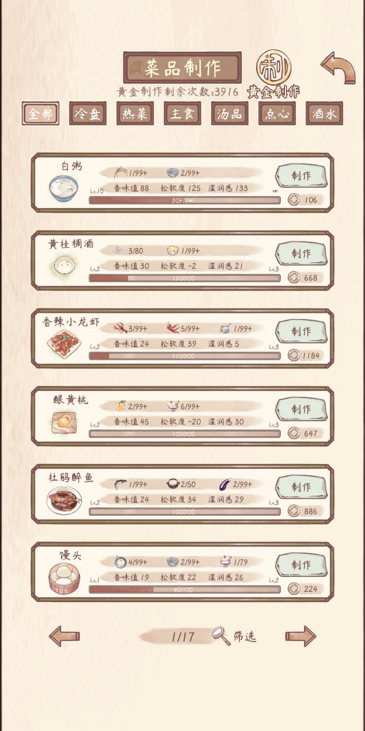 本文所有菜谱皆为我自己用的比较多的,不代表其他人,也欢迎其他人的友善讨论。图为 筛选后等级降序1.酿黄桃推荐指数:★★★★配方:2 黄桃 + 6 白砂糖优点:种子都能在集市买到,高级作物需求少,售价可观,性价比高缺点:白砂糖单次产量不算太高,须频繁制作2.黄桂稠酒推荐指数:★★★★配方:3 糯米 + 1 干桂花优点:种子都能在集市买到,高级作物需求少,售价可观,性价比高缺点: