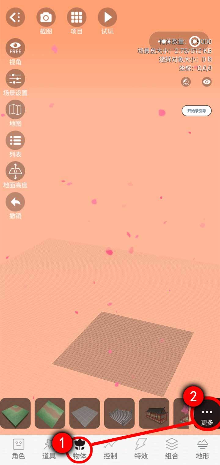 异次元神社 创作教程 在”选择创建类型“里选择”游戏“,进入”益智游戏模板集合“,选择《异次元神社》,就可以开始一步步学习怎样做一款问答游戏《异次元神社》。 01 获取素材的方法 在制作游戏之前我们先了解一下如何获取项目中的素材,我们所需要的角色、道具、物体、特效都在对应的素材库中,以打开物体素材库为例,点击屏幕下方“物体”按钮,然后点击屏幕右侧“更多”按钮,然后点击弹出的“素材库”按钮 02 素