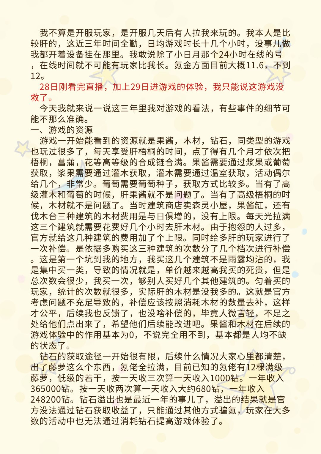 事先声明 本文章没有收到任何好处,从一个普通玩家的角度上写这篇入坑攻略,本人也是各种普通资源都毕业的情况,树花水池化石蘑菇菖蒲苔藓火盆灯等都毕业,包括葡萄树,白桦,灌木都已经毕业,总共游玩时长不知道,但横跨了一年左右,期间也有退游时间。这篇文章将从不同角度来诠释是否要选择入坑《小森灵》以及入坑后的攻略。如果你是新入坑或者想入坑的,希望你能耐心看完前半部分文章。 玩前需知 1.适合人群 首先,《小森