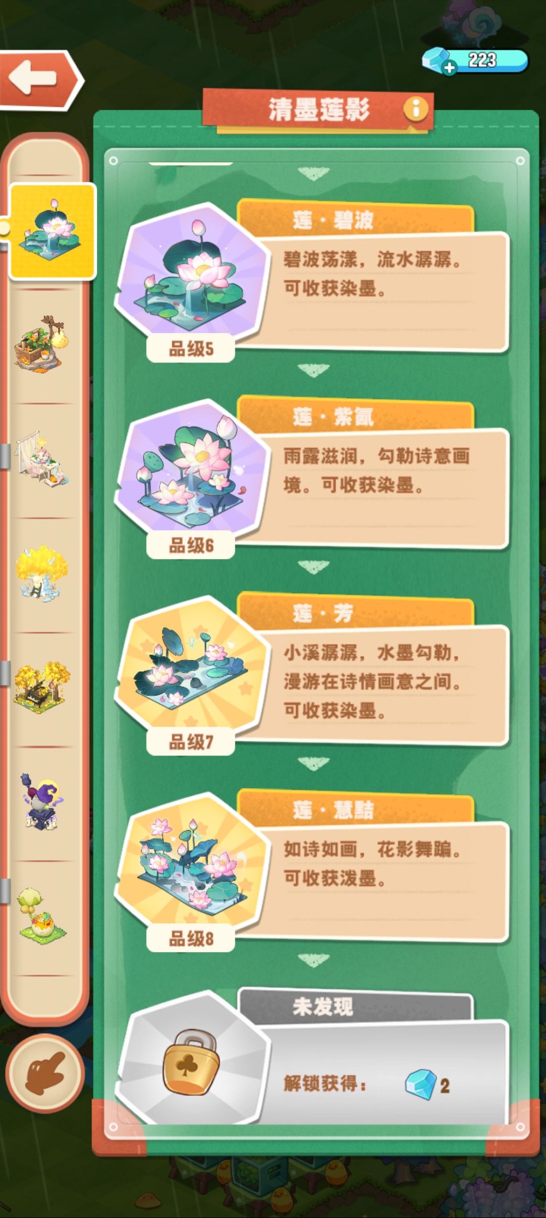 新荷花,5级开始产染墨(1级),2级的染墨就能开物品。 染墨物品:果酱、木材、抱枕(有10次保底) 点评:过程流畅,无动物参与,即合即开。 ———————————————— 旧荷花,5级开始产藕片(1级),2级的莲藕能通过动物采集出物品。 莲藕物品:果酱、木材、抱枕(无保底) 点评:过程繁杂,需要动物参与(紫藕消耗特定动物体力)。 龙宫,8开始产龙珠(1级),4级能开物品。 龙珠物品:果酱、木材、