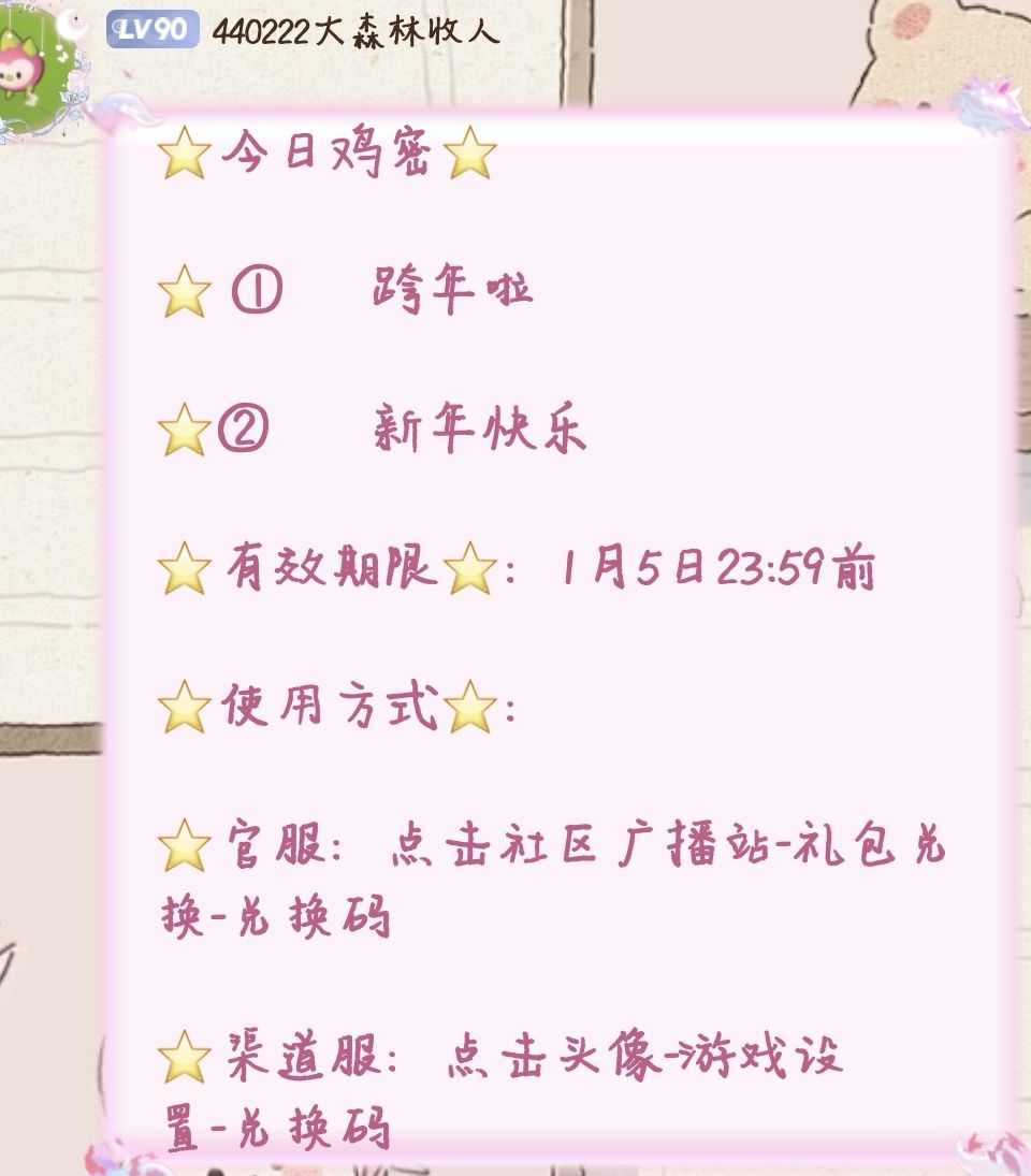 ⭐今日鸡密⭐ ⭐ ① 跨年啦 ⭐② 新年快乐 ⭐有效期限⭐:1月5日23:59前 ⭐使用方式⭐: ⭐官服:点击社区广播站-礼包兑换-兑换码 ⭐渠道服:点击头像-游戏设置-兑换码