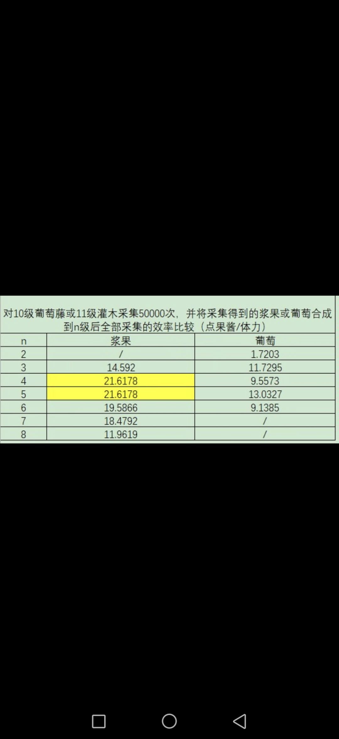 更适用于有月卡的情况,效率比较如图。 举个栗子,比如标黄的情况,开自动采集满级灌木可以获得3级的大堆浆果,将大堆浆果合成为4级大裹浆果,开自动采集采集4级浆果,获得很多中瓶果酱,五合到最高级后使用。整个过程不用自动采集,只需要手动合成。 另外,如果使用手动采集到剩下一次,再五合,再采集剩下一次,再五合。。。。这种办法,需要浆果合成到6级后效率才有显著提升,6级之前效率反而比全部合成不采集效率更低。