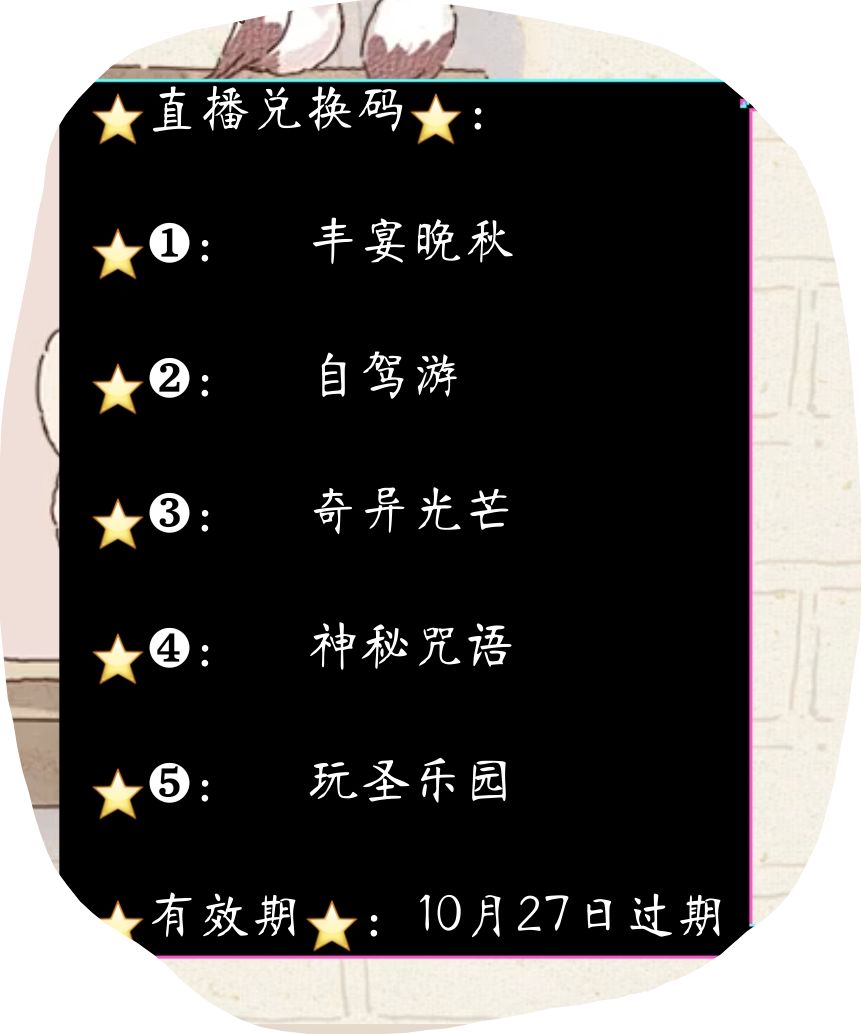 ⭐直播兑换码⭐: ⭐❶: 丰宴晚秋 ⭐❷: 自驾游 ⭐❸: 奇异光芒 ⭐❹: 神秘咒语 ⭐❺: 玩圣乐园 ⭐有效期⭐:10月27日过期#小森灵#福利