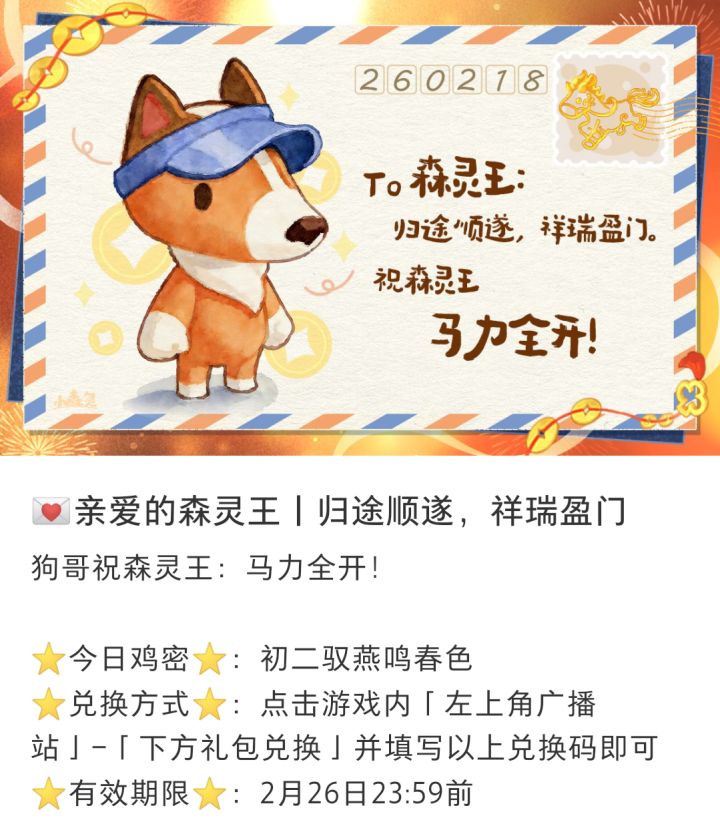 ⭐今日鸡密⭐:除夕暖红灯贺岁⭐兑换方式⭐:点击游戏内「左上角广播站」-「下方礼包兑换」并填写以上兑换码即可⭐有效期限⭐:2月26日23:59前⭐今日鸡密⭐:初一骏彩迎新春⭐兑换方式⭐:点击游戏内「左上角广播站」-「下方礼包兑换」并填写以上兑换码即可⭐有效期限⭐:2月26日23:59前⭐今日鸡密⭐:初二驭燕鸣春色⭐兑换方式⭐:点击游戏内「左上角广播站」-「下方礼包兑换」并填写以上兑换码