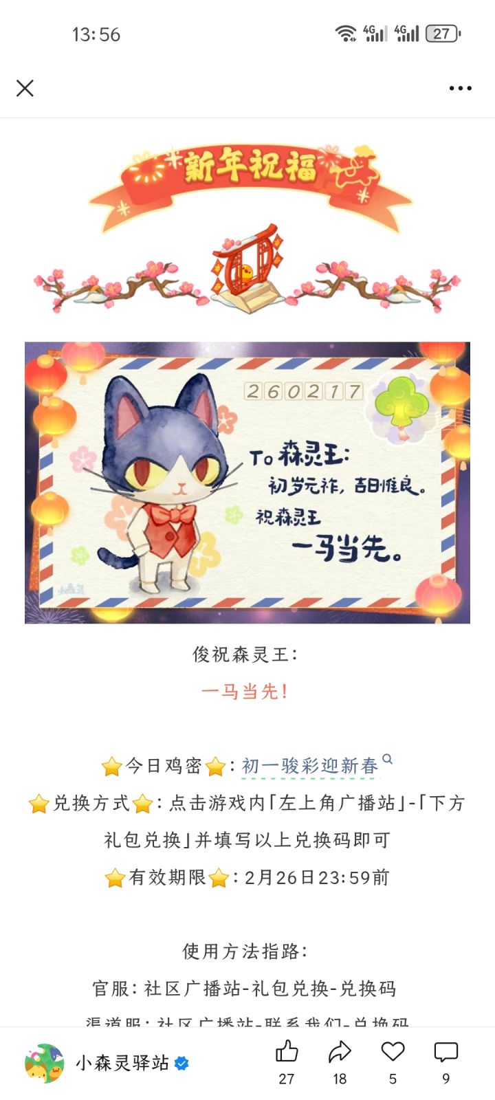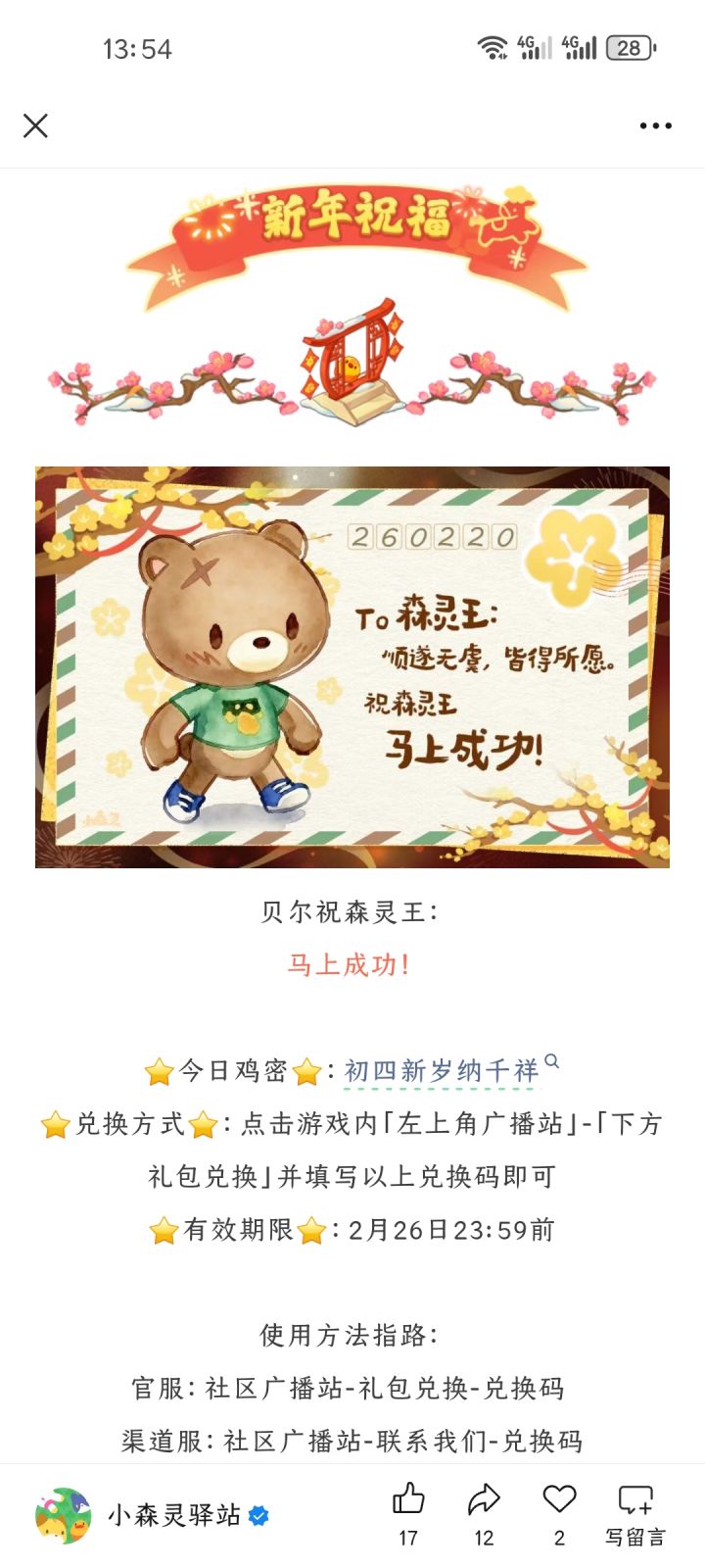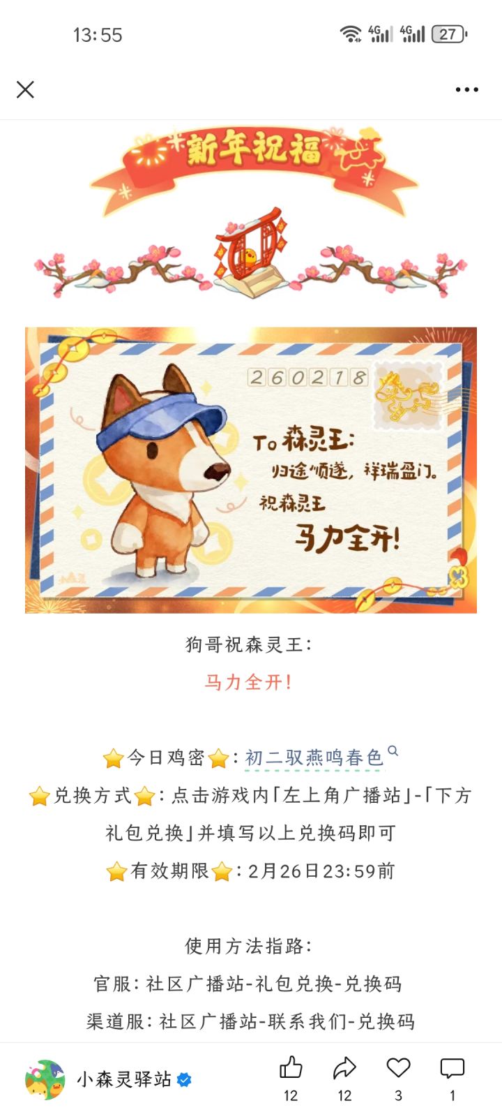 ⭐今日鸡密⭐:除夕暖红灯贺岁⭐兑换方式⭐:点击游戏内「左上角广播站」-「下方礼包兑换」并填写以上兑换码即可⭐有效期限⭐:2月26日23:59前⭐今日鸡密⭐:初一骏彩迎新春⭐兑换方式⭐:点击游戏内「左上角广播站」-「下方礼包兑换」并填写以上兑换码即可⭐有效期限⭐:2月26日23:59前⭐今日鸡密⭐:初二驭燕鸣春色⭐兑换方式⭐:点击游戏内「左上角广播站」-「下方礼包兑换」并填写以上兑换码