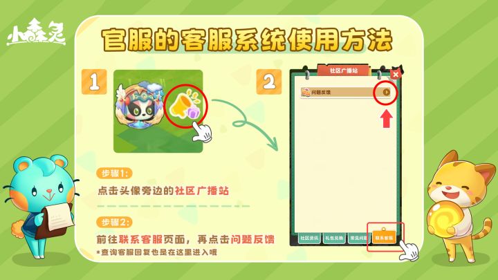 “游戏有不明白的地方,在哪里能找到客服呀?”“我有问题需要咨询客服,但是我社恐,怎么办?在线等!挺急的!”小森灵客服系统正式上线啦~森灵王根据图中路径即可进入客服系统,在界面里填写您需要反馈或咨询的问题,果冻鸡们会根据你的信息进行问题定位处理哦~👉PS:森灵王如没看到客服系统,可以先在对应平台的应用商店把游戏更新到最新版哦#攻略#游戏安利#游戏推荐#游戏讨论