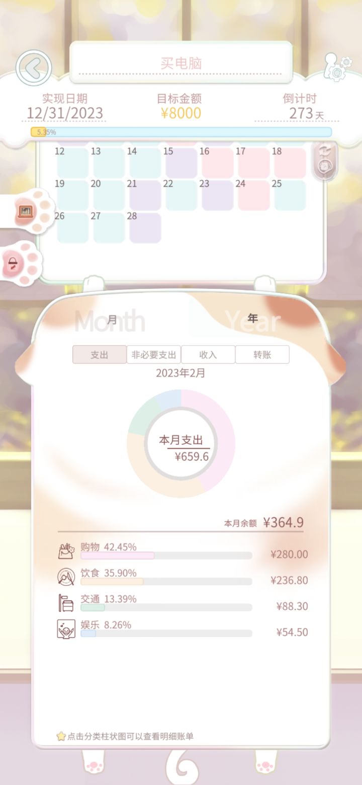 根据记账的消费类型掉落一点养猫的道具,比如娱乐类掉落逗猫棒这种,好歹游戏跟记账接个轨吧?