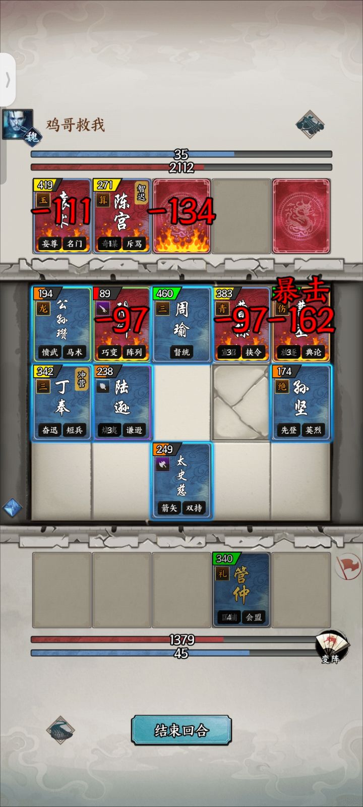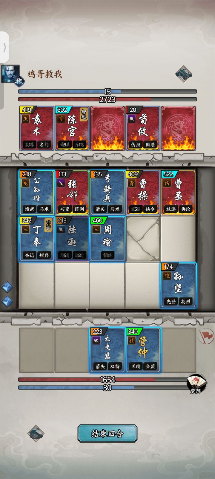 ID9148 里索蜀国(一到五号位)孟获诸葛亮刘备姜维庞统姜维(城内四号位)因为拥有尚武和研习所以尽量在十二回合回合后(6轮)出山,这样能触发两次研习和三次尚武,就能达到如图所示的111武力和113智力,这样使得物理法术双修的姜维进攻能力数一数二并且拥有93统率的姜维也拥有不错的防御能力,出山后姜维最好配合本阵容中的庞统的奇谋技能先攻击一次,再使用姜维的普通攻击,这样就可以一次触发四段伤害,基本能秒掉所有的单体单位。主将姜维也有不错的团队续航增益,一般卡位于已方城内四号位是最佳的坑位,主打防守反击,挑衅技能能对过路的单位造成毁灭性的打击!四号位姜维将会是本阵容的输出核心。庞统(城内五号位)作为凤雏拥有强大的群体控制和AOE输出能力,配合上智谋或者研习兵法能够更加的强大,实战的主要打法就是奇谋配合姜维达到四段伤害秒单体单位,或者连锁连敌方兵团,造成伤害的同时,令其无法移动,这时候只要使用诸葛亮火攻其中一个单位,火势大概率将会蔓延至其相邻单位,达到COMBO的效果。99的智力也能使其技能的成功率始终处于高几率水准,庞统不愧是蜀国核心谋士。诸葛亮(城内二号位)配合智力10的兵法后能达到113的基础智力,这样的智力能够让火攻成功率始终处于及其高的成功率。而火攻的主要目标最好是敌方输出核心,燃烧状态能够降低敌方的统率,同时减少武力伤害和武力防御。并且能够有几率蔓延开来。实战中可以配合庞统连锁使用,事半功倍。而洞察能够使已方一个小兵团获得一次反弹伤害给野外敌军的保护盾。能够在敌方单位多的时候根据情况使用,是不俗的保护神技。孟获(城内一号位)蛮王的召唤夫人技能能够在开局就充实已方野外阵容,如果将祝融放在一号位出城,那么必定祝融会被召唤在已方城下二号位,这样左半区将会显得安全。祝融(召唤于二号位城下)祝融拥有及其强大的卡位能力,陷阱技能(谋定技)能够轻松对低智力的敌军进行威慑效果。在对峙过程可以将祝融卡在二号位中线处,则敌方二号位单位将不会轻易出城。敌方如果出城,则继续后退,卡住中线,也能让对方不轻易的继续前进。刘备(三号位)可与徐庶轮替!拥有操练的刘备在统率破百后也拥有不错的战斗能力,无论是补牌还是战斗都是不俗的。雪恨也有一定的功能性。所以我选的是捷报和司运这些功能性兵法。等到后期出山也是不弱的单体单位。也能有一定的补牌效果。前期后手开局打法就是上一号位孟获,祝融必定召唤在二号位,然后可以使用火攻对方一个核心输出单位(图示最好是张辽)。先手上了孟获可以考虑祝融直接上一格利用陷阱技能卡住中线,后面看情况祝融后撤。或者卡住已方三号位城下。中期打法就是连锁敌方兵团和火攻,令火蔓延开来,等姜维6轮加了两次研习和三次尚武后姜维出山利用庞统达到四段伤害进行反击。刘备就是补牌,在统率加到破百后可以出城与姜维一起战斗!攻坚10的姜维在推塔方面有用极强的能力,也能为没有相邻敌军的野外队友加血。本打法教学战报号视频37383395367731战术讨论加我游戏ID9148 里索