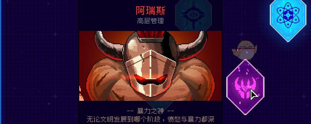 霓虹深渊中的暴力之神就是阿瑞斯,解锁最终boss阿瑞斯的条件为获得阿瑞斯币,想要获得阿瑞斯币的话需要在恶魔房献祭数次,每当右下角的暴力值槽累计满后便可以进入一次恶魔房。获得阿瑞斯币后再进入最终boss的房间便可以遇到暴力之神阿瑞斯。 角色积攒暴力值槽有两种方法,一种是在冒险过程中受到伤害,另一种为触碰红色的水晶、宝箱或是大门,普通的水晶、宝箱以及大门在受到攻击之后便会变为红色,此时触碰会失去生命并