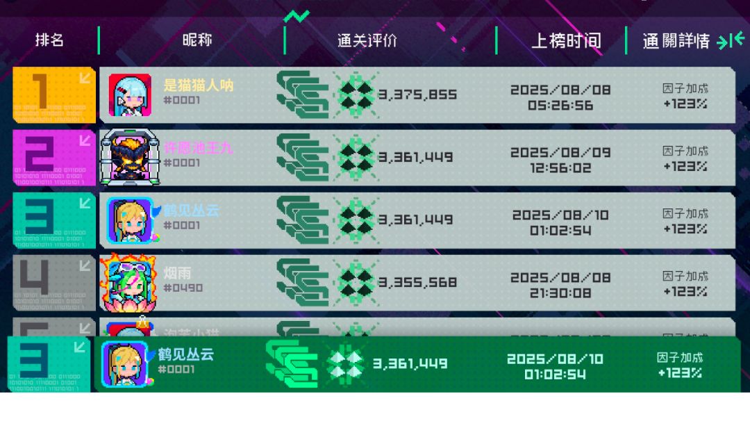 火莲版同调攻略已更新,详见: OK啊 随便一凹又是前三。本期虽然是火莲因子,但依旧是精灵弧光的主场,火莲实在是又吃手法又吃运气,目前排行前三均为精灵弧光。 “弧光,你到底干了什么?!没有火莲大人,我们如何冲击同调?如何抗衡电盾因子?”众人跺脚,瞪着黄色身影。 弧光淡笑一声: “很简单,我来C不就是了?” 说完,她的气息终于不再掩饰,显露而出!逆因子冲榜!横推榜一! ⸝⸝⸝ ╸▵╺⸝⸝⸝