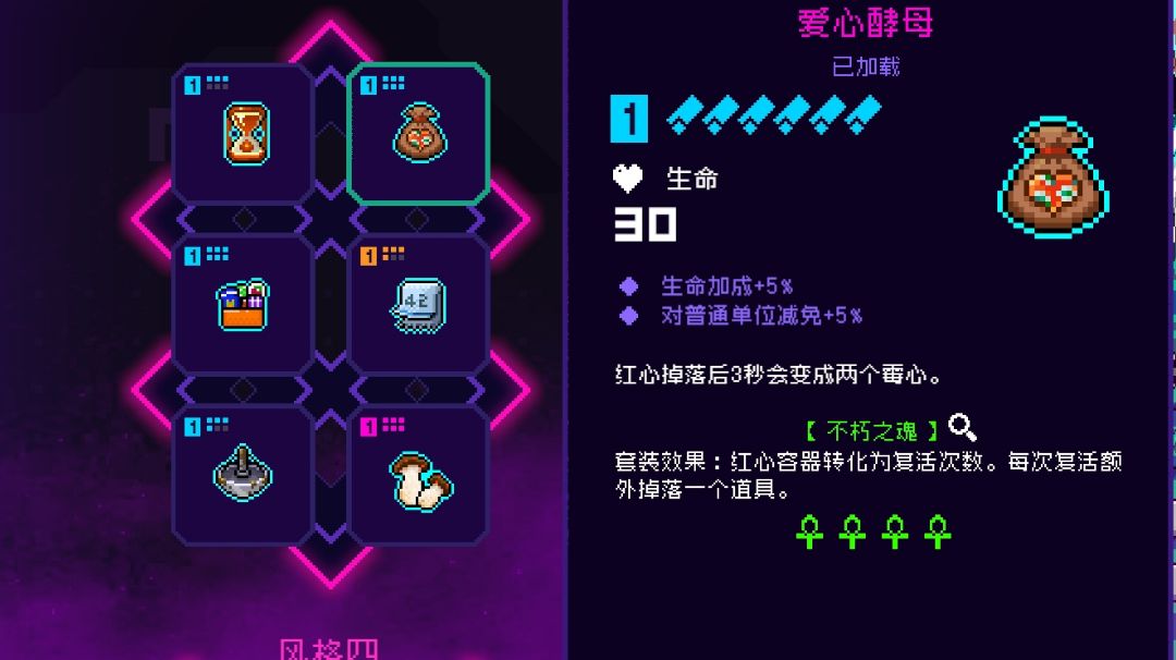 首先我在这里表明对这件套装的看法:鸡肋(食之无味,弃了也没关系)。 不朽之魂位置为:一 二 四 五位置。 不朽之魂套装特点:血量变为复活次数(注:r6没有血量=没有复活次数!!!!)。每复活一次就给一个道具(队友复活你,姜饼人免死都不给道具)。血量变为复活次数就不能通过红心来恢复次数(但增加血量上限的道具可提供复活次数,这个是重点。)思路为利用霉心来提高复活血量上限以提高复活次数。注:套装以后不会