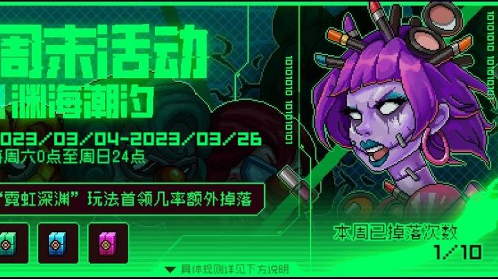这里可知,活动从3月4日到3月26日,也就是4个周末,因为每次是周六到周日,所以一个周10个箱子,共40个箱子 描述是,在霓虹深渊玩法中,几率掉落各等级箱子,但几率未知,这里注意是霓虹深渊玩法!!!也就是说打拟合和诸神是没有掉落的,记好笔记,再就是只有高级箱必定掉落霓虹币,其他的箱子是概率,高级箱也有保底,可以理解为5次,必定有一次,就算脸再黑也至少有两个高级箱,就是这个活动最少最少也有保底4个币
