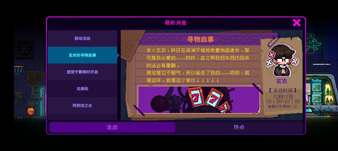17号开始每周6晚上八点到十点有个限时活动【寻物启事】,一直持续到1月七号 主要玩法就是每期一个特定boss 打他掉落活动道具 提交后有几率给霓虹币或者实物奖励 这期boss是777.荐打霓虹深渊模式,最低的难度阿古斯 进本后直奔boss,出了777打掉无论出没出都退出关卡,没出就重开继续刷。只看前4层。因为第五层必定是阿古斯不会是活动boss所以没必要打,看到第四层boss不是活动的就可以退了 推