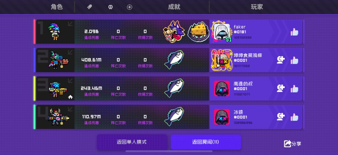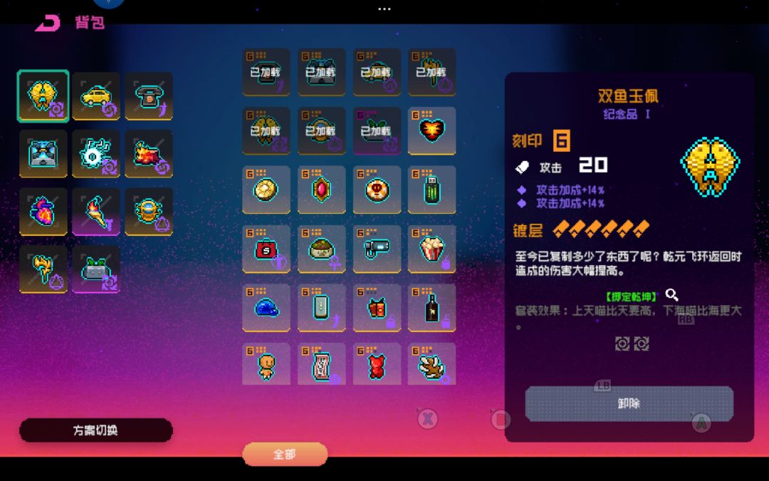 这个模式地图空旷台阶少。终于有一个能让金扎尽情蹦跶的场地了!就是跳跃键按到手累。 2号位生日蛋糕和6号位兄弟会徽章必带,其他位置随意,你可以主带近战套,也可以带闪电套当个快乐的陀螺电疗师。 进图解锁生日蛋糕和兄弟会徽章之后就开始起飞。 拿近战伤害,攻击,属性伤害 纪念品拿跳跃套,近战套,其余看你搭配可拿闪电、冰刃、爆炸套。 副武器推荐拿电锯链(增加近战伤害那个)或者范围吸金币的。